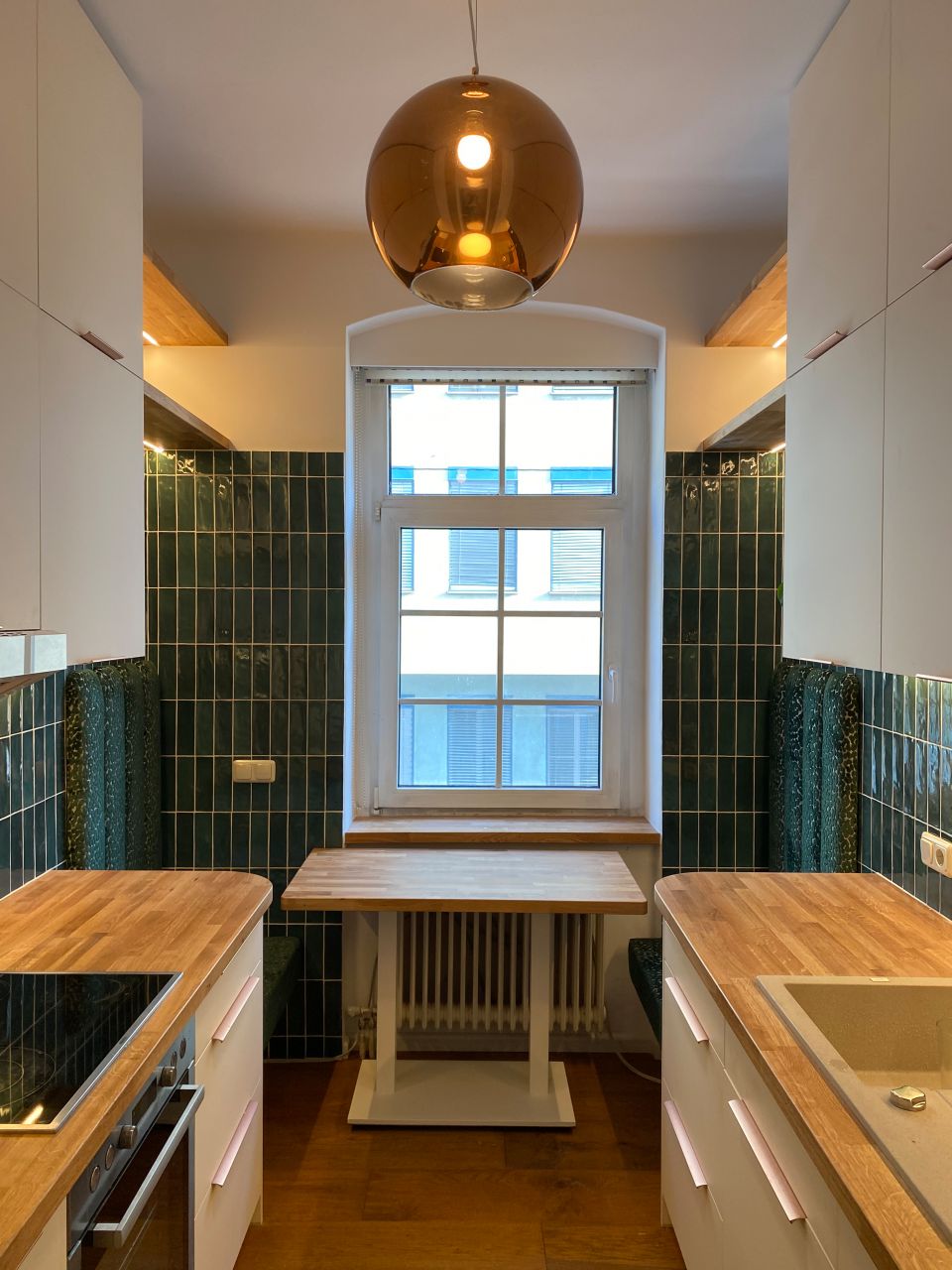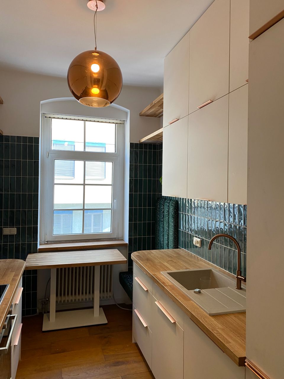 Neugestaltung einer Küche in einer Linzer Altbauwohnung … weiß & grün, Holz & Kupfer.